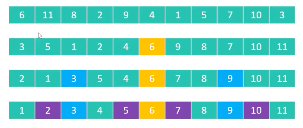 快速排序的本质:逐渐将每一个元素都转换成 pivot,并将其放到正确的位置上。