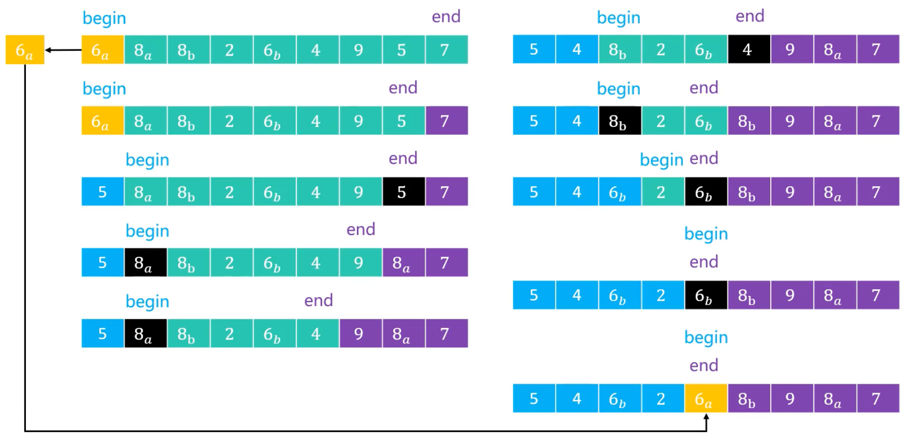 6a和6b是相等的,为什么要将6b放到左边呢?这样不就丢失了稳定性吗? 见后文的解释。注意:快速排序的稳定性不仅仅取决于这一点,比如