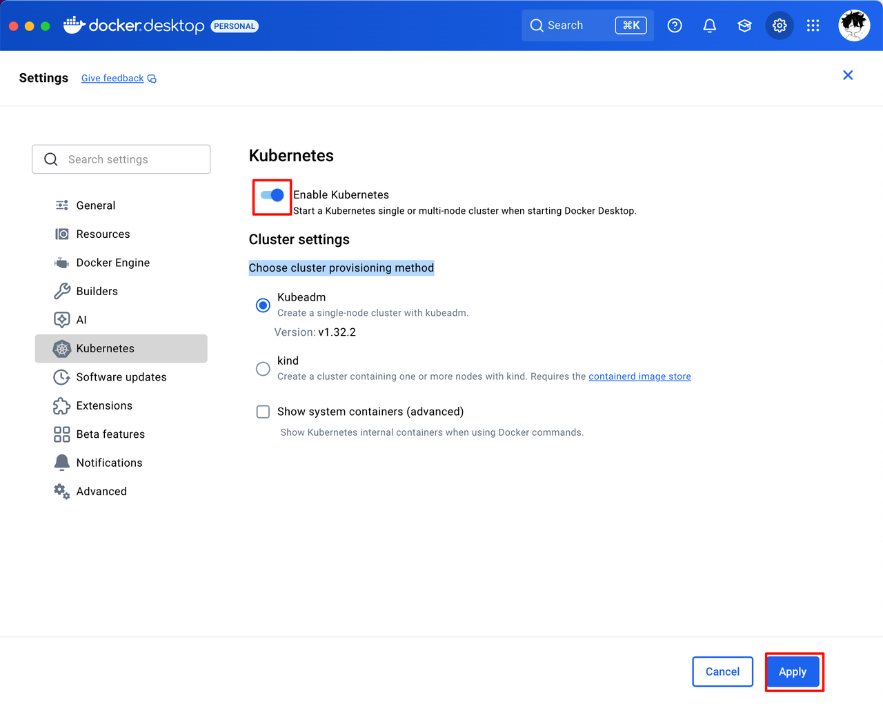 Docker Desktop 自带了 Kubernetes 集群,可以直接启用。