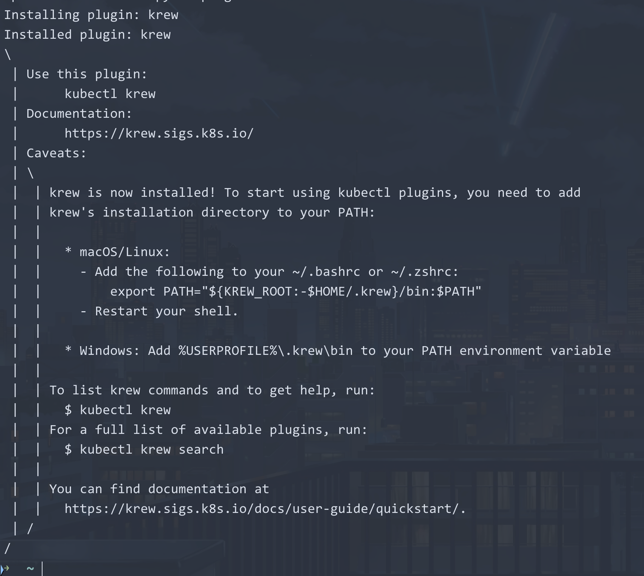 shell(set -x; cd "$(mktemp -d)" &&OS="$(uname | tr '[:upper:]' '[:lower:]')" &&ARCH="$(uname -m | sed -e 's/x86_64/amd64/' -e 's/\(arm\)\(64\)\?.*/\1\2/' -e 's/aarch64$/arm64/')" &&KREW="krew-${OS}_${ARCH}" && curl -fsSLO "https://github.com/kubernetes-sigs/krew/releases/latest/download/${KREW}.tar.gz" && tar zxvf "${KREW}.tar.gz" && ./"${KREW}" install krew )复制到终端执行即可: