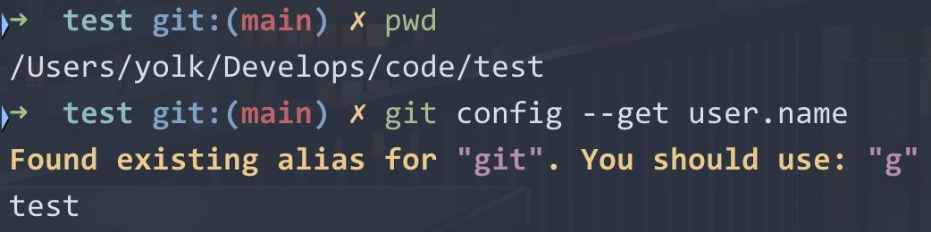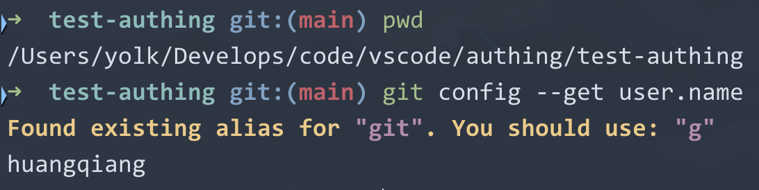/Users/yolk/Develops/code/vscode/authing/目录下,执行如下命令:shell-- 创建一个项目 mkdir test-authing cd test-test git init -- 查看配置是否符合预期(输出的用户名应该是`~/.gitconfig_authing`文件中配置的) git config --get user.name