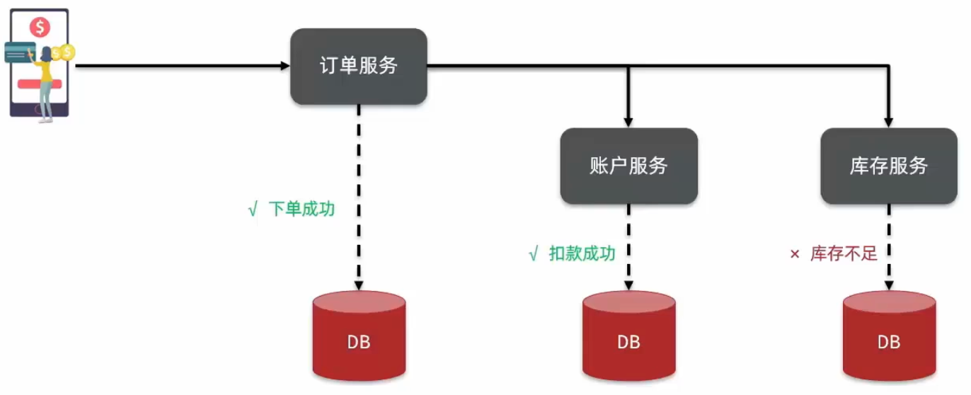 上面异常情况原因是因为库存服务抛出了异常,它的事务进行回滚,但是订单服务和账户服务的事务已经提交,导致数据不一致。