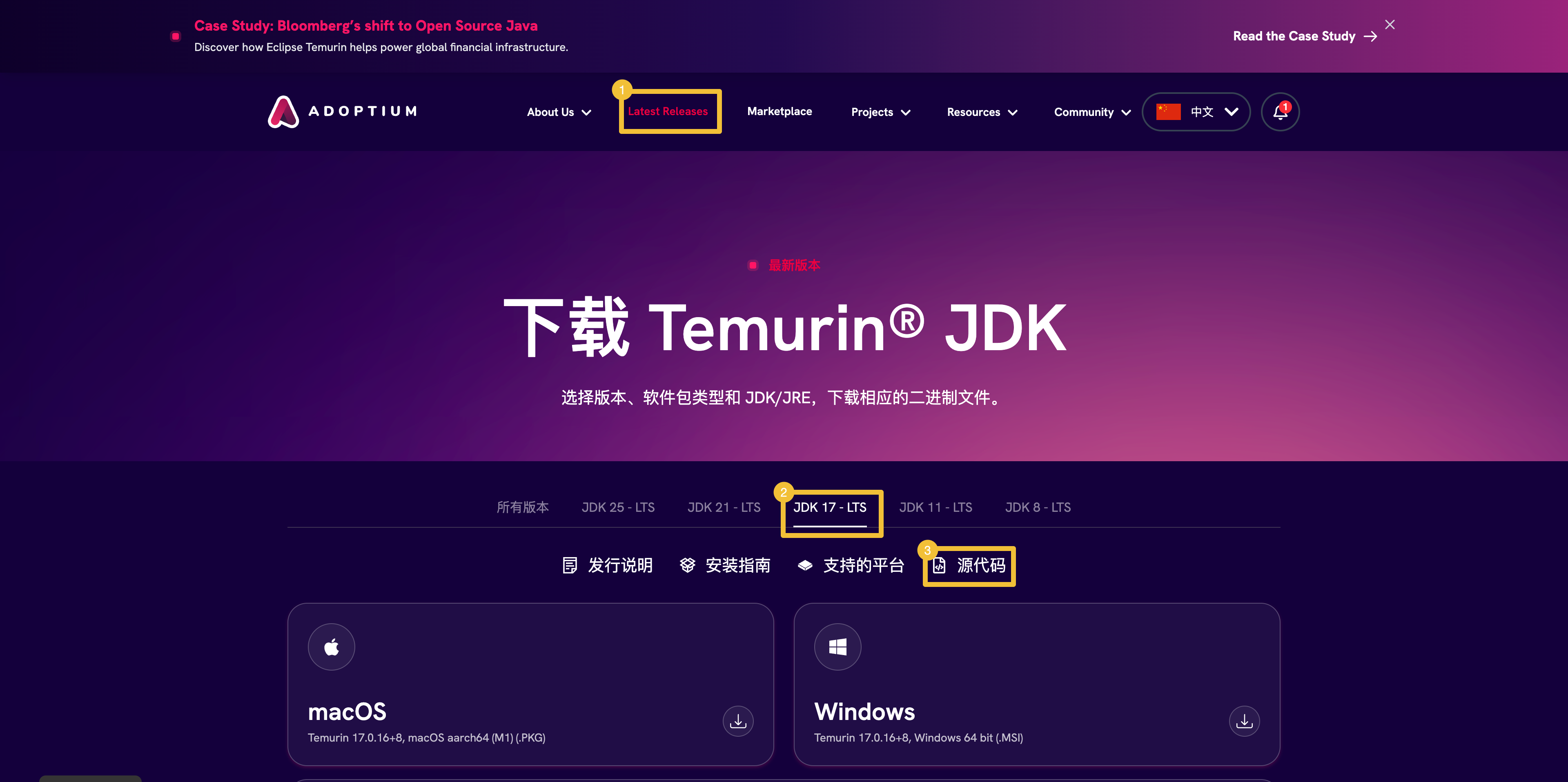 其中,Eclipse Temurin是由Eclipse 基金会下的Adoptium社区维护的开源 JDK 发行版,它完全免费,提供不输于商业 JDK 的性能和稳定性,被业界广泛认可与采用,我们这里就使用它的源码进行编译。官方网站