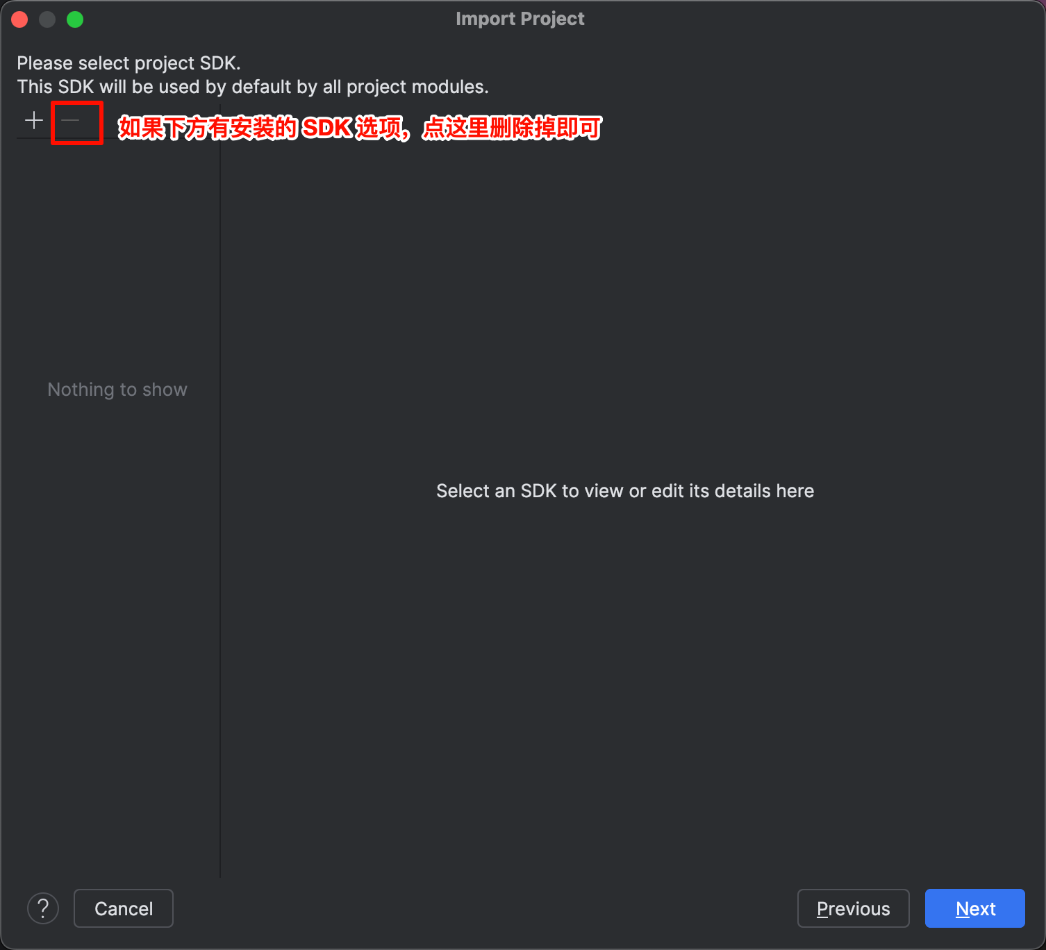打开IDEA,选择File -> New -> Project from Existing Sources...,选择源码目录,后面的步骤中会提示选择 SDK,也不要选择,把可选的 SDK 删除掉,点击Next即可: