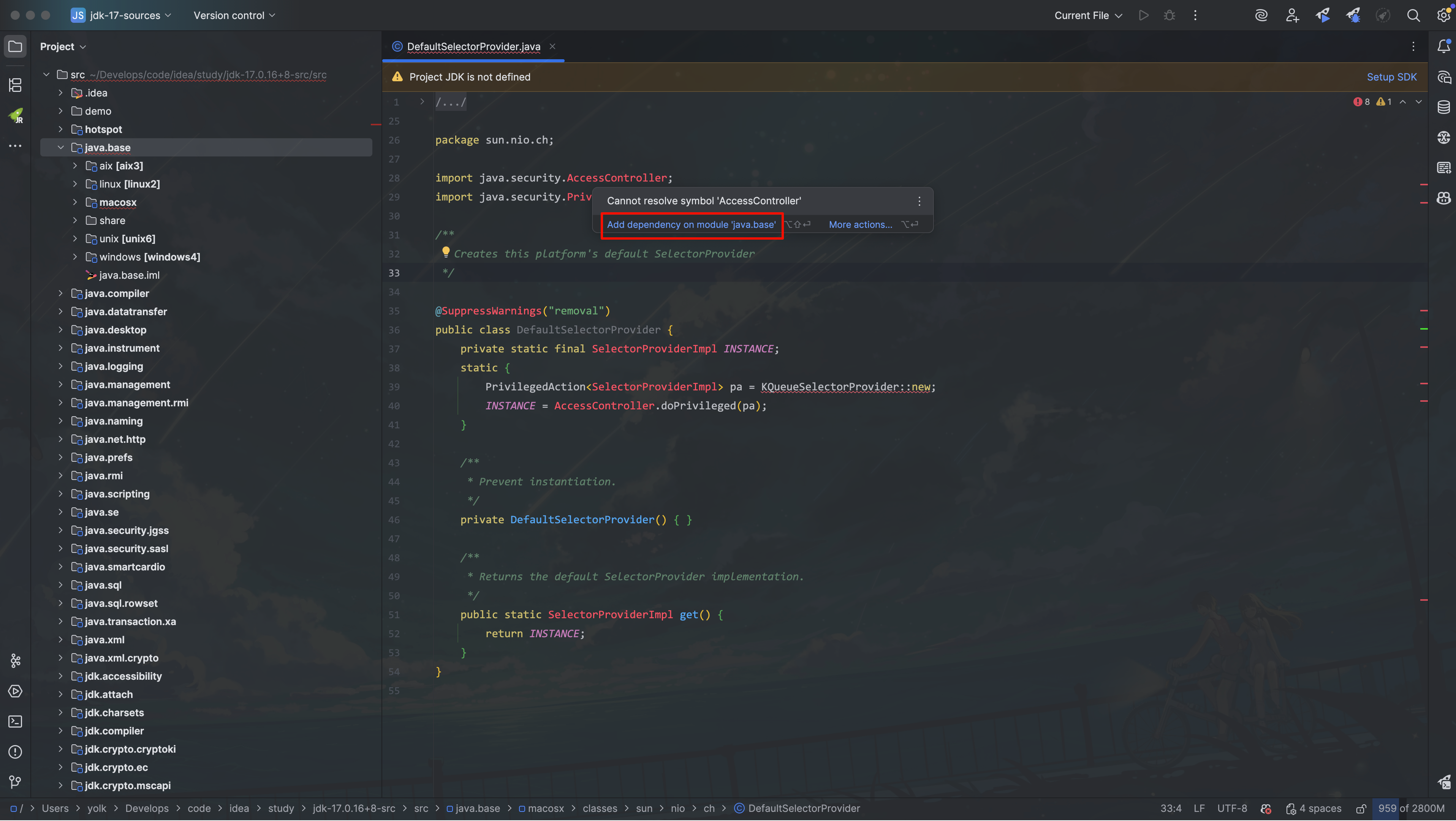 目前就导入成功了,可以愉快地阅读和修改源码了,如果发现某些类有红色报错,可能是模块没有关联,鼠标悬浮上去,点击Add Module Dependency即可:
