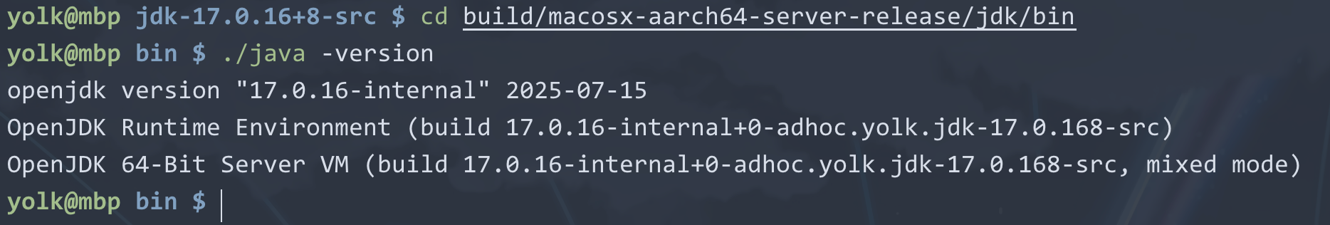 这不就是我们平时下载的 JDK 目录结构嘛,我们可以进入bin目录,执行java -version命令,查看编译后的 JDK 版本: